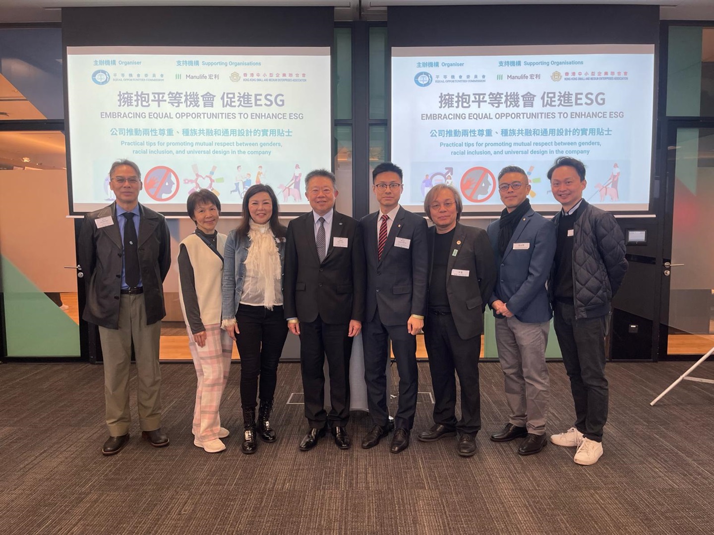 鄭仲邦主席、黃成輝副會長、林蘆副會長、傅佳濱副主席、陳蒨霖會董及周玹羽會董2月28日出席平等機會委員會主辦的《擁抱平等機會 促進ESG》研討會。