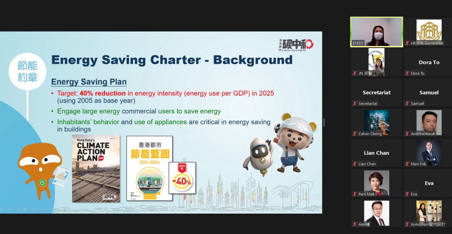 政府於2021年10月更新《香港氣候行動藍圖2050》,訂下更進取的減碳排放策略、目標和措施,致力爭取於2050 年前實現碳中和。 要成功應對氣候變化,全體市民必須積極行動。為了鼓勵各方,包括工商界、專業人士和青少年加入香港深度減碳之旅。本會於2022年10月10日應機電工程署及環境局邀請,為本會成員舉辦網上分享會,讓他們更了解如何能做到節約能源及參與政府的節能約章與4T 憲章計劃。
